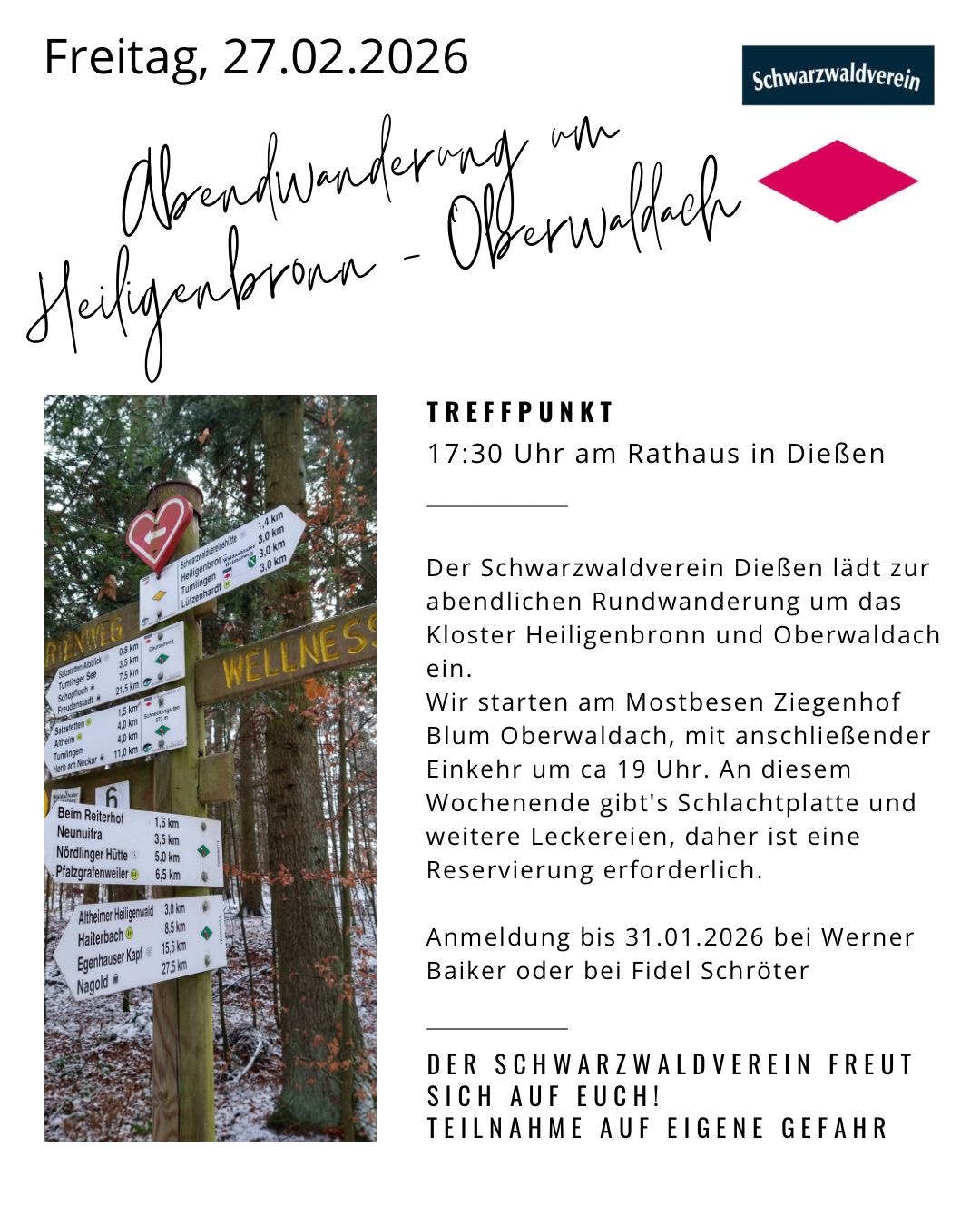 Abendwanderung Oberwaldach - Heiligenbronn mit Einkehr im Mostbesen